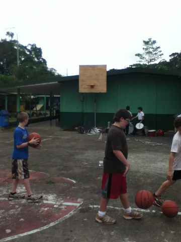 Today we went to the Chilamate school. We brought basketballs for the kids to play with during breaks and lunch. When we arrived, the students looked excited but weren't sure what to do with the new goals. We gave them some time to play with the basketballs and shoot. We then showed them some of the basic fundamentals of basketball. We also taught them the great game of knockout. The students looked excited to learn a new game. With every shot, they would cheer each other on to encourage each other. Stillman showed a couple of students the basics of basketball with the help of a student who spoke English and Spanish. One 10 year old student said, "I've had a basketball since I was three, but I've never had a place to use it!" This made us feel very happy that we were helping this school and God allowed us to enhance this boy's life. Bradford said this was the most fun he had ever had! David said the kids he was playing with always let him lead the group because they were happy that we had brought basketballs to them. The group of students that were at school during the morning session left early today at 10am. They looked disappointed to have to leave the new play area. After students left, we began pulling weeds and filling in holes in the ground of the playground. We also hauled gravel for a new walkway. Then we walked back to the Eco lodge for a quick break and lunch. We are looking forward to returning to the school for one last time tomorrow to play with the kids before going to La Fortuna on Wednesday. This post was written by our team of boys. :)
