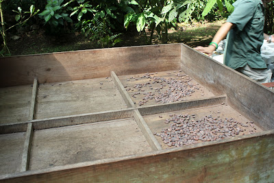| Looking at how the cocoa pods grow. Notice them growing on the trunk of the tree. |